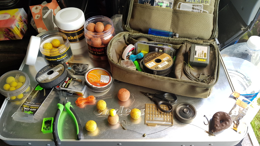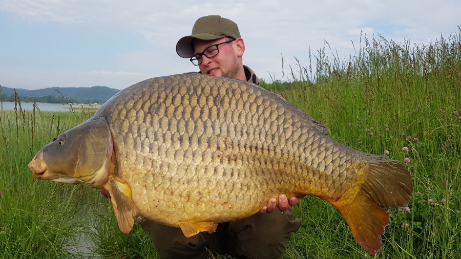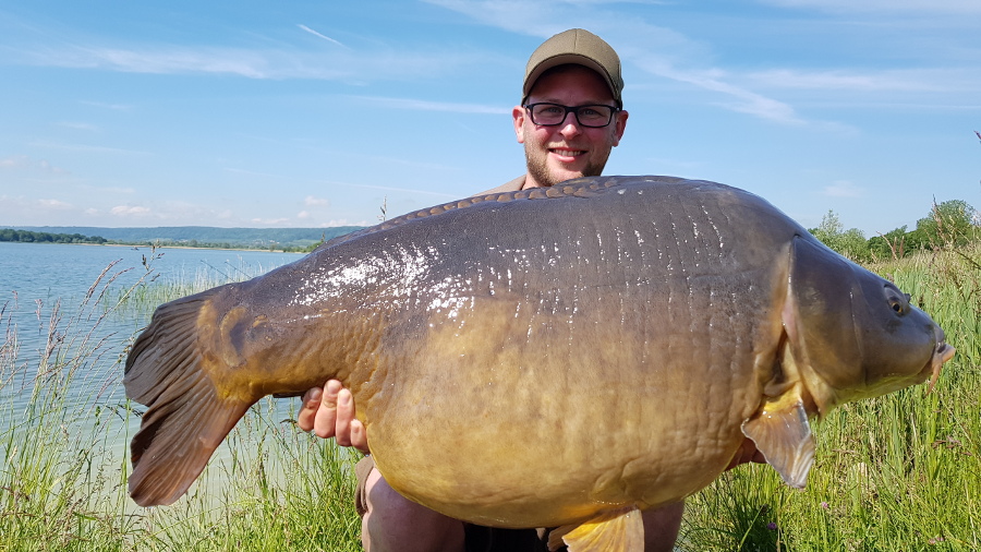 „Wir waren Ende Mai am Lac de Madine. Ich konnte dort zwei schöne Brummer zum Landgang überreden. Der Spiegler brachte es auf 24 Kilo. Weightless Hookbait sei Dank. Die Ruten lagen mehrere Tage lang in Krautlöchern bis sie abliefern. Eine Hand voll Bloodwormbollen und Tigers haben es gerichtet.“