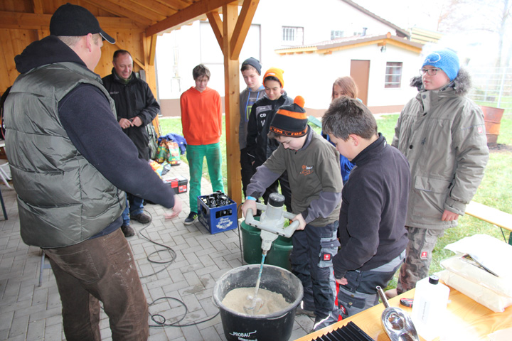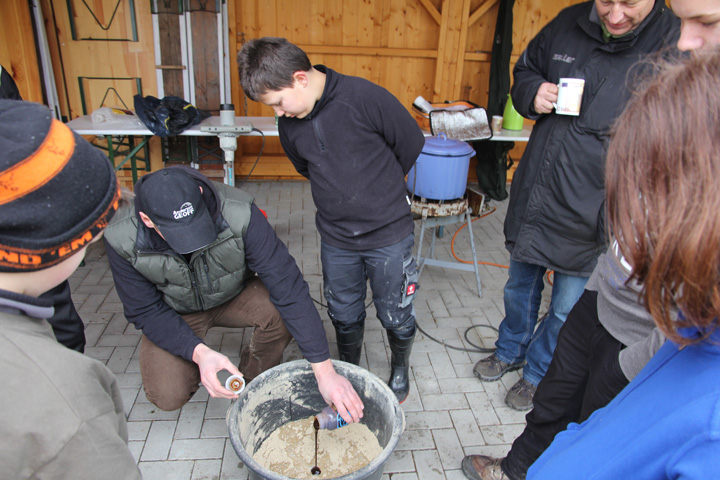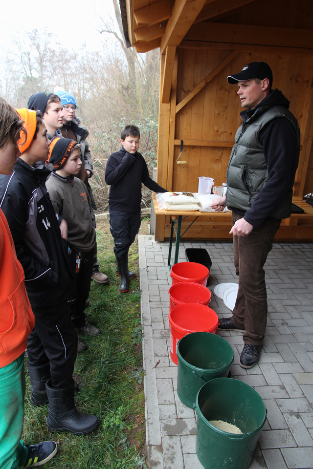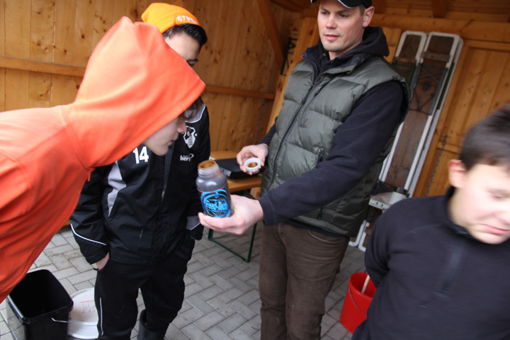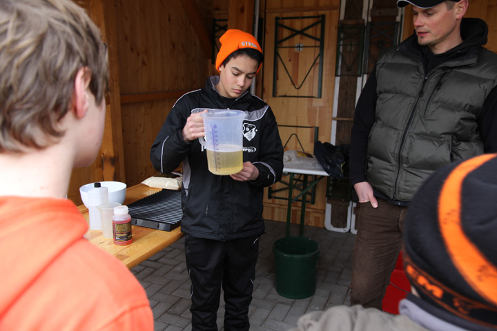 Der Workshop fand am 01.02.2014 auf dem Vereinsgelände des ASV Klein-Auheim statt. Bereits bei der Ankunft von Jan und Volker waren die Kids heiß wie fritten fett. Sie wollten unbedingt mehr über Boilies wissen. Aus was bestehen die bunten Karpfenkugeln, warum fangen sie so gut und natürlich auch wie man sie selbst herstellen kann. Jan Brauns plante den Ablauf des Workshops inhaltlich. Er bereitete im Vorfeld zwei Boiliemixe vor, einen fertig gemischten und einen, bei dem die Zutaten noch nach Rezept abgegewogen und gemischt werden mussten. Hinzu kamen noch Flavours, Additive, Konservierer und Liquids, die die Kids nach empfohlener Angabe selbst dosierten.