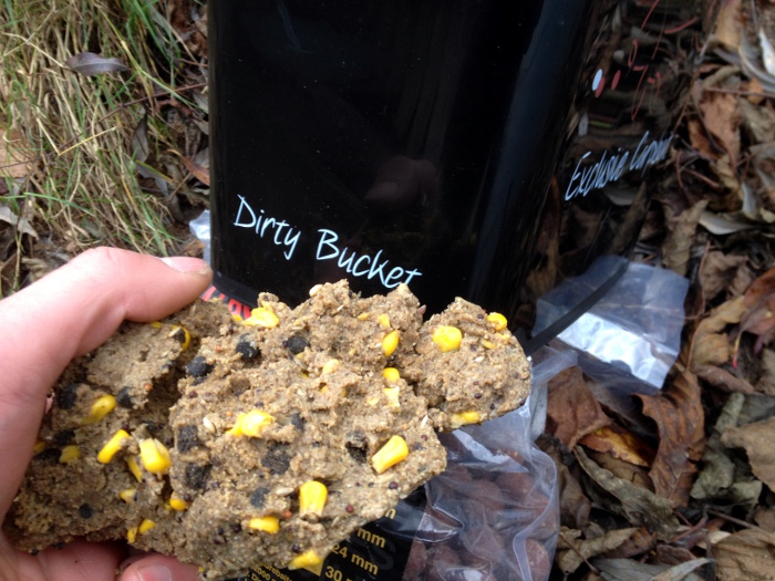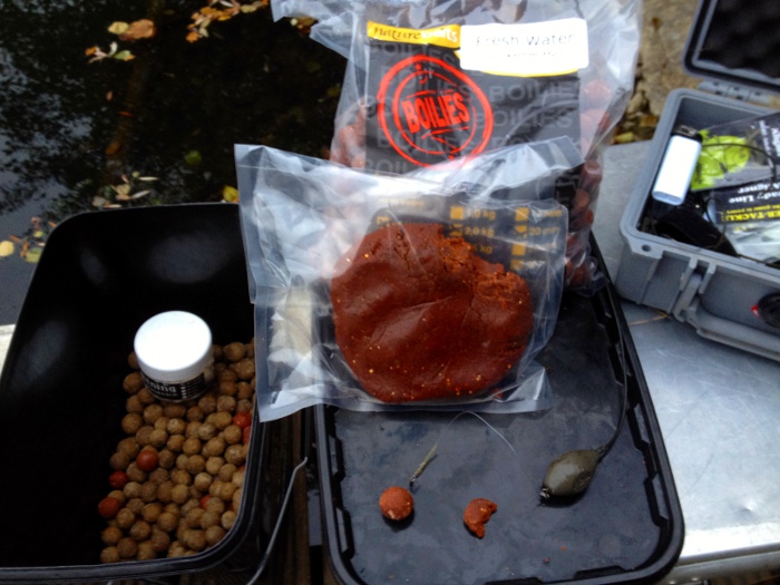 Also hatte ich etwas Teigmix mit Dosenmais und Fresh Water Liquid angemischt und sparsam den Platz befüttert auf dem ich die Karpfen so oft aber machtlos beobachtet hatte. Im Verhältnis fütterte ich 1/10 Boilies zu Teig. Also 900 Gramm Teig und nur 100 Gramm Boilies. Bei den Boilies griff ich wie so oft in diesem Jahr zu den GLM Boilies in 20mm und mischte einige Dickenmittel Boilies in 24mm darunter.