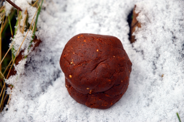 (Wer hat denn hier „Häufchen“ gemacht? Die Teigkugel im Schnee sieht schon merkwürdig aus… )