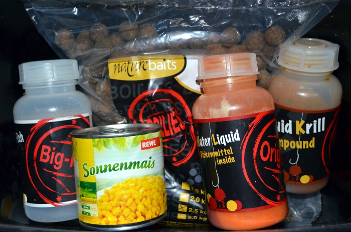 Also hatte ich etwas Teigmix mit Dosenmais und Fresh Water Liquid angemischt und sparsam den Platz befüttert auf dem ich die Karpfen so oft aber machtlos beobachtet hatte. Im Verhältnis fütterte ich 1/10 Boilies zu Teig. Also 900 Gramm Teig und nur 100 Gramm Boilies. Bei den Boilies griff ich wie so oft in diesem Jahr zu den GLM Boilies in 20mm und mischte einige Dickenmittel Boilies in 24mm darunter.