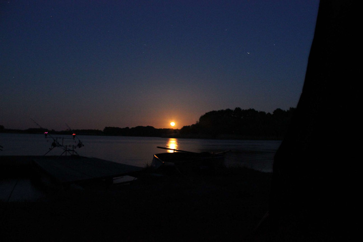 Nach dem Abendessen stand ich neben den Ruten, als plötzlich der Bobin ganz langsam in Richtung blank wanderte! Nach dem Aufnehmen der Rute dachte ich erst, es sei nichts oder eine Brasse, aber mein Bruder meinte, ich sollte mal nach rechts schauen und erst da bemerkte ich, dass der Fisch in einem großen Bogen auf mich zu schwamm.