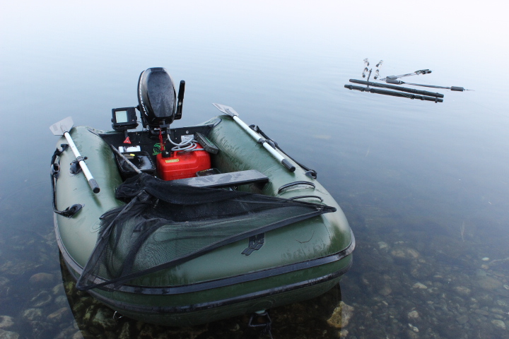 Nach einer schnellen Begehung des Gewässers wurde ein Platz auserkoren und anschließend wurde mit dem Schlauchbot und Benzinmotor eine schnelle Lokation gemacht. Siehe da, ich fand auf Anhieb sehr vielversprechende Spots in weiter Entfernung.