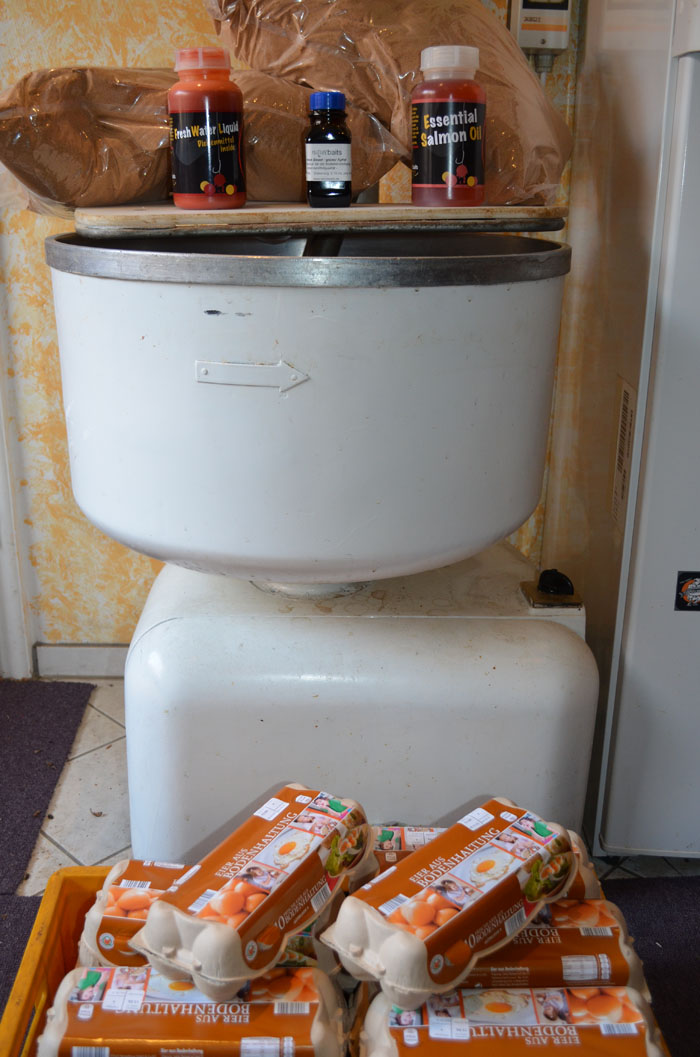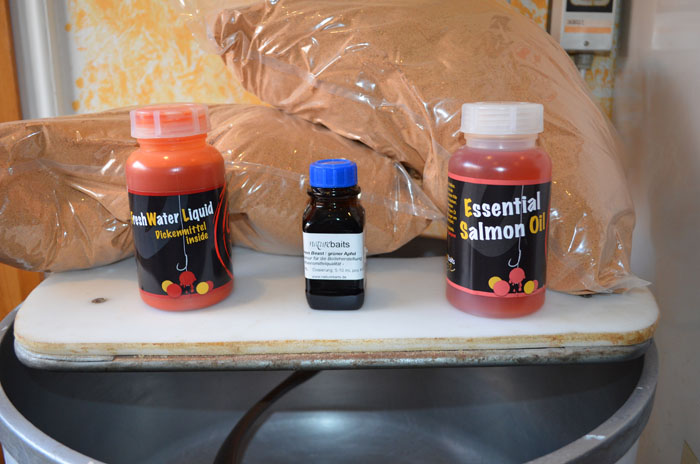 (Als zusätzliche Attraktoren fügt Andreas dem Fresh Water Mix Essential Salmon Oil und natürlich Freshwater Dickenmittel Liquid,