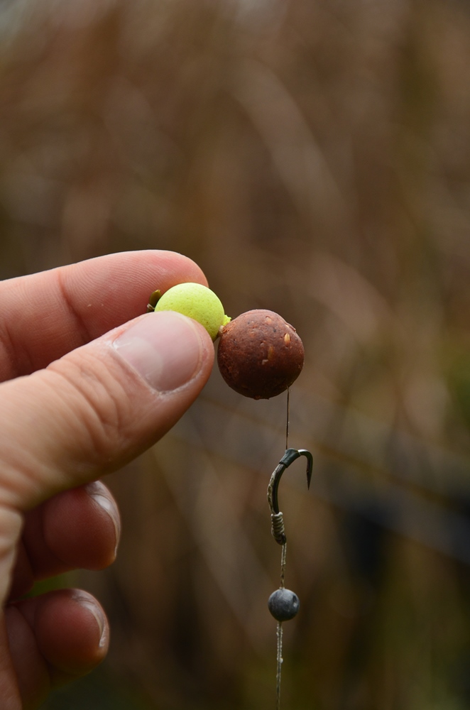 (Ein kleiner auffälliger Schneemann findet nun ganz einfach den Weg ins Maul. Hier ein Dickenmittel 2.0 Boilie kombiniert mit einem 12mm PopUp.)