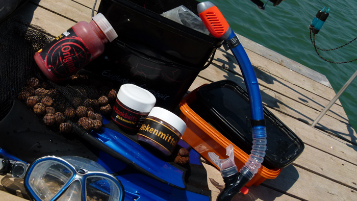(Mein Endtackle: Schneemann, Univerza von Carpleads, geflochtenes Vorfachmaterial und Inliner-Blei. Rechts: Dickenmittel und GLM Boilies verfütterte ich über den Sommer tütenweise.)