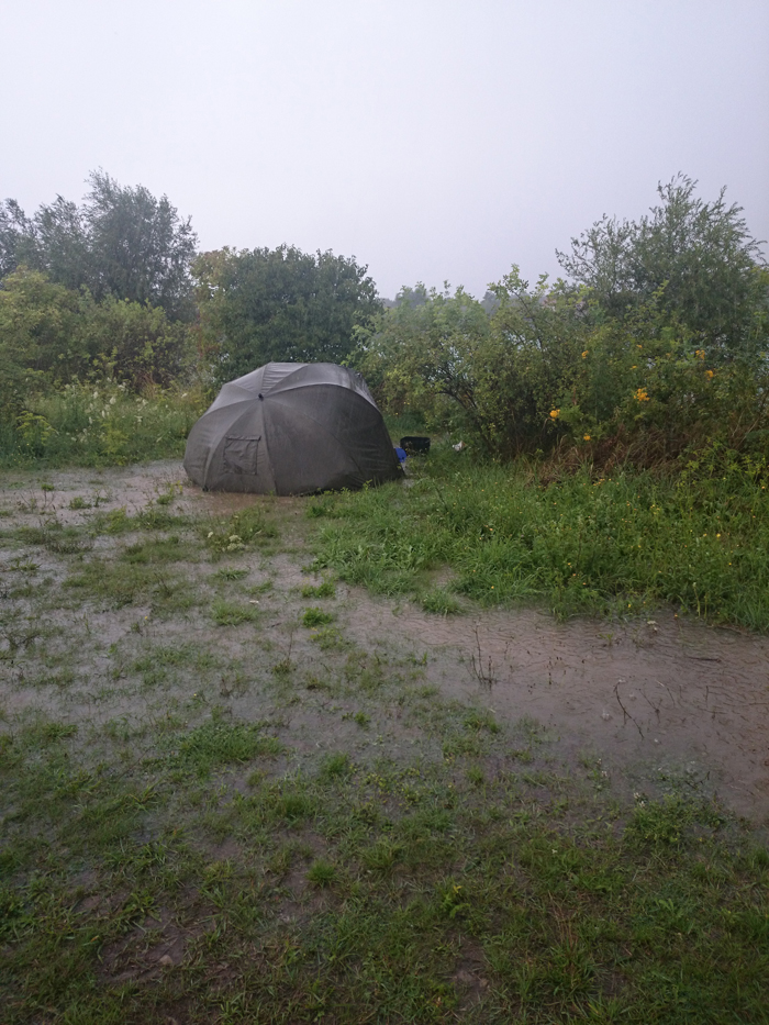 (Schnell griff ich zum Spaten und grub einen Entlastungskanal. Von weitem: Mein Angelplatz wurde vom Wasser verschluckt.)