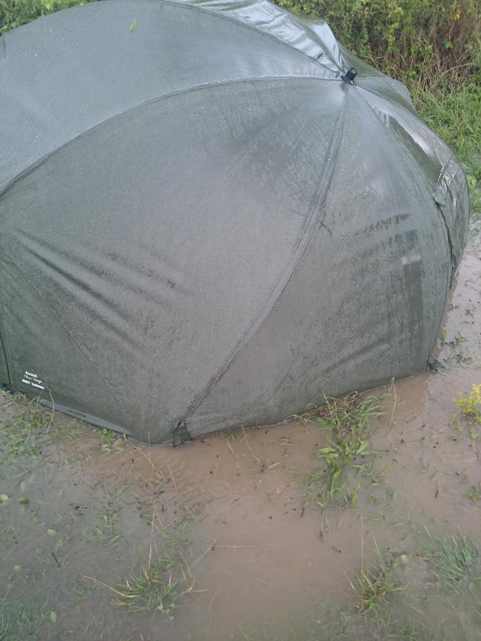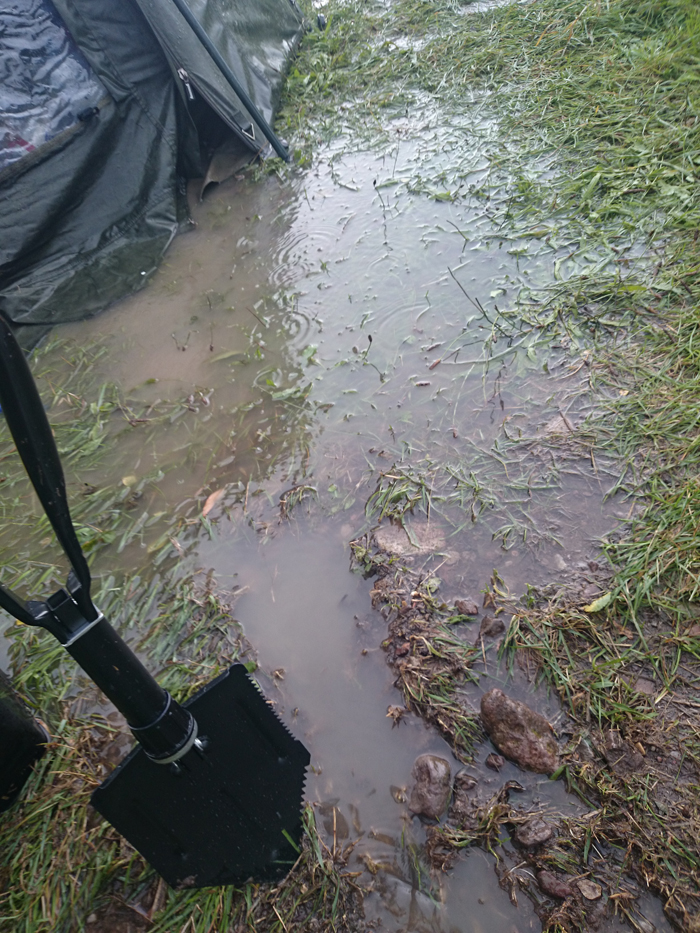 (Schnell griff ich zum Spaten und grub einen Entlastungskanal. Von weitem: Mein Angelplatz wurde vom Wasser verschluckt.)