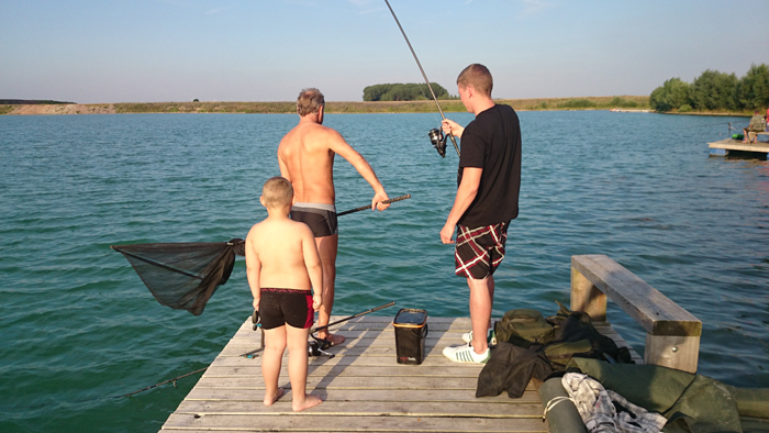 (Auf Regen folgte Sonnenschein. Im Sommer gehört Publikum zum Angeln am Baggersee dazu. Rechts: ein weiterer auf Naturebaits.)
