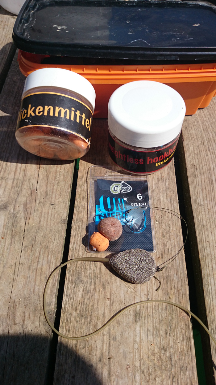 (Mein Endtackle: Schneemann, Univerza von Carpleads, geflochtenes Vorfachmaterial und Inliner-Blei. Rechts: Dickenmittel und GLM Boilies verfütterte ich über den Sommer tütenweise.)