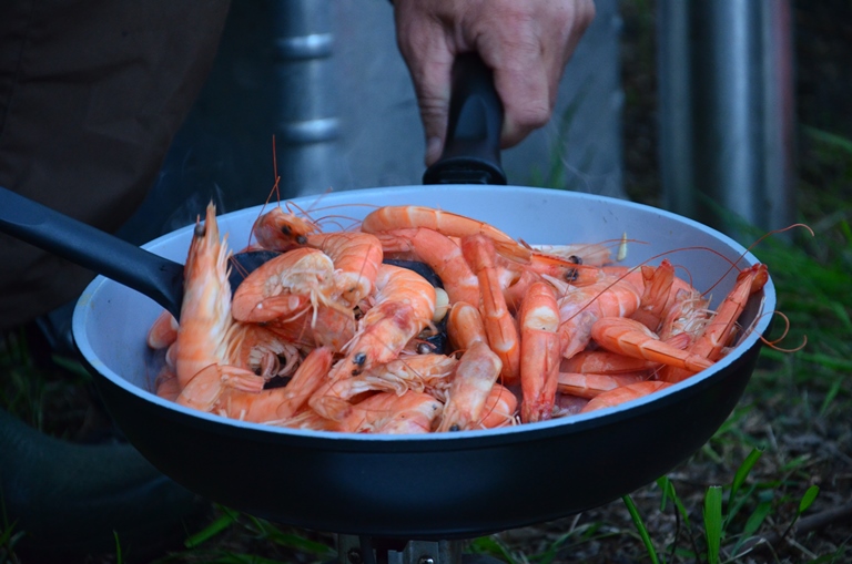Samstag gegen 21 Uhr steuerten wir unser erstes Ziel an. Der See war leer, kein Angler weit und breit – perfekt! Müde von der Fahrt wollten wir die erste Nacht Kraft tanken. Also wurden die Liegen aufgebaut und das Abendbrot in die Pfanne gehauen. Kurz angebrutzelt und schon konnte der Gaumenschmaus munden.