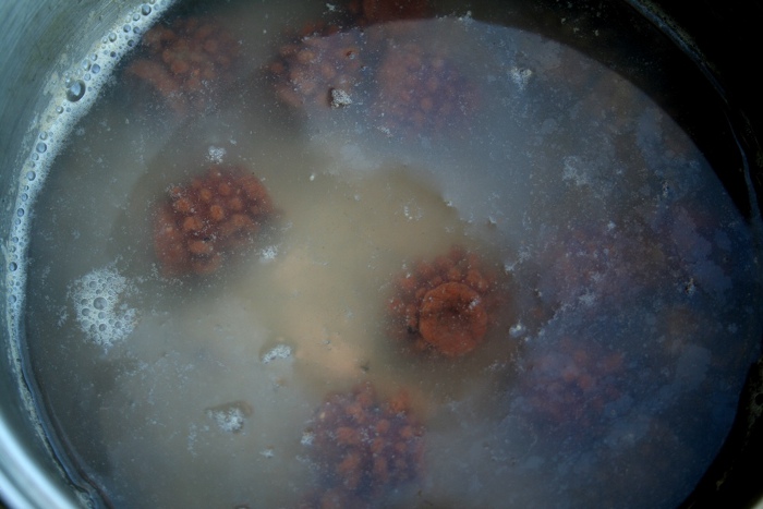(Schritt 2: Köder etwas weniger als einem Minute Kochen, den „Boilie-Igel“ etwas abtrocknen lassen und staunen.)