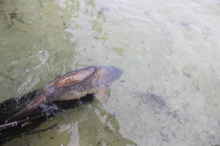 Die Drills vom Steg aus waren ein Genuß, den bei Sichtweiten bis auf 6-7 Meter konnte man den Fisch schon sehr früh sehen und den Drill quasi „live“ verfolgen. Ist auch ein besonderer Nervenkitzel, wen man sieht, wie der Fisch sich durch Seerosen pflügt, oder in eine Wasserleitung schwimmt und so ziemlich jedes Hindernis mitnimmt, um den Haken los zu werden. Ich sag nur so viel, nichts für schwache Nerven, schon gar nicht, wenn ein Guter am Band hängt. Im Drill sind sie mörderisch und kaum zu halten, aufgrund der großen Flossen auch kein Wunder.