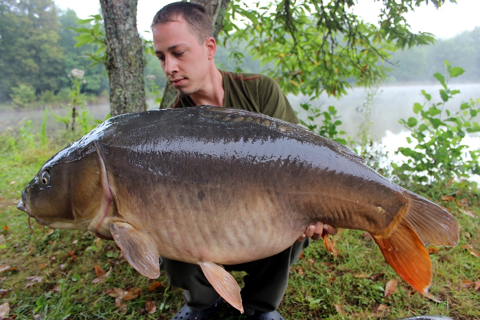 In der letzten Nacht montierte ich ein 20er Glm und ein 20er Dickenmittel drauf, diese Änderung der Taktik war nötig, wir brauchten dringend etwas Schlaf für die etwa 1000 km lange Fahrt in die Midi-Pyrenea! Wie erhofft ließen uns die Kleinen etwas Schlaf nach holen. Um 7 Uhr klingelte das Handy und es hieß abbauen. Etwas planlos saßen wir noch im Zelt, gezeichnet von den schlaflosen Nächten als plötzlich der Delkim los schrie. Nach dem Anhieb sah alles nach einem etwas Kleineren aus, aber als er zum ersten Mal die Wasseroberfläche durchbrach, sahen wir einen fetten Spiegler mit einem Riesen Kopf, der sich aber ohne große Mühe über den Kescher ziehen ließ. Wir konnten es nicht glauben und waren einfach nur happy. Nach dem Fotoshooting durfte er wieder in sein Element.
