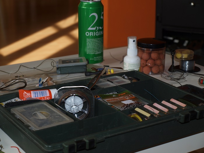 (Auch die Tacklekiste muss gefüllt sein. Vorfachmaterial, Haken, Bleie, Wirbel. In der Wildnis ist der Nachschub schwierig!)