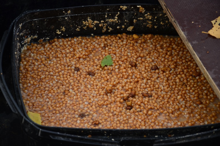Am Anfang der Futterkampagne verwende ich gerne kleine Partikel wie Vogelfutter, Weizen oder Hanf. Kleiner Tipp am Rande: Vor dem Kochen 1-2 Knoblauchzehen durch eine Presse drücken und hinzugeben oder einen Ess-Löffel Curry, Paprika usw.