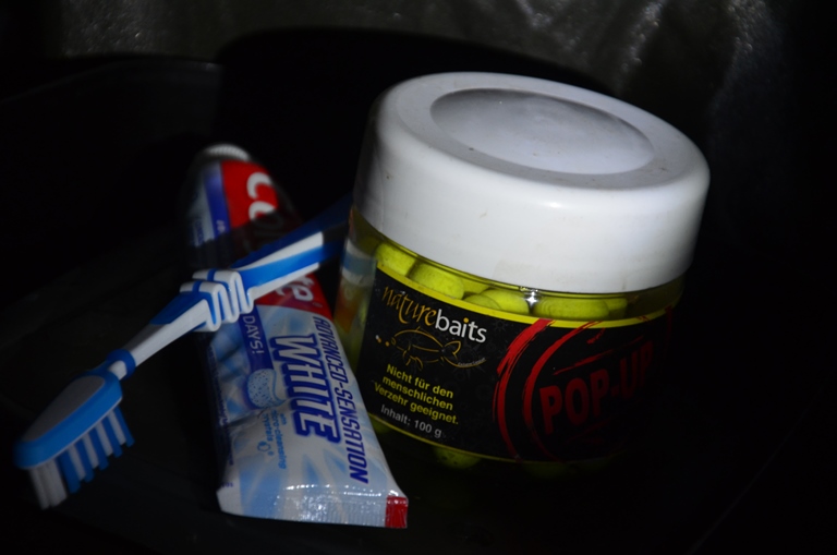 (Auch beim Ansitz findet eine Große Menge an Beifutter den Weg ins Wasser. Eine Mischung aus Boilies und Partikel / etwa 3 -4 Kg Pro Rute.)