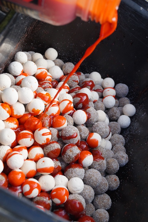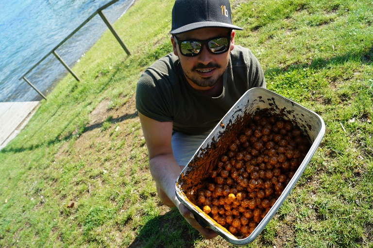 Zusätzlich verfeinerten wir unsere GLM Boilies mit Fresh Water Liquid und GLM-Extrakt, die wir in 18 beziehungsweise 24 mm abrollten. Wir beschlossen ausschließlich geringe Mengen an Futter zu vergeben und dies verteilten wir präzise auf den Spot.