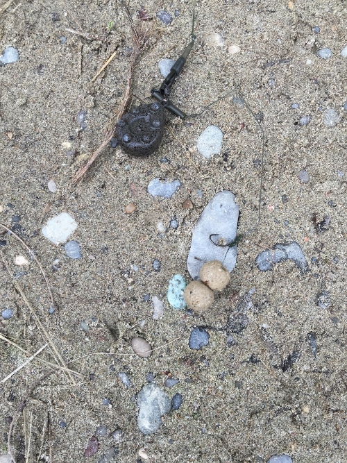 (Ans Haar plante ich mit zwei 16er GLM zu fischen. Wer viel in Sandgruben unterwegs ist und kein Aufsehen erregen möchte, für den sind diese Kugeln wie geschaffen. Wie man sieht waschen sie sich super schnell aus und bekommen eine sandähnliche Farbe…)